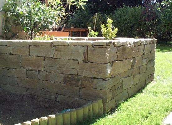 Création d'une jardinière en pierre séche, avec des moellons de Gneiss beige.